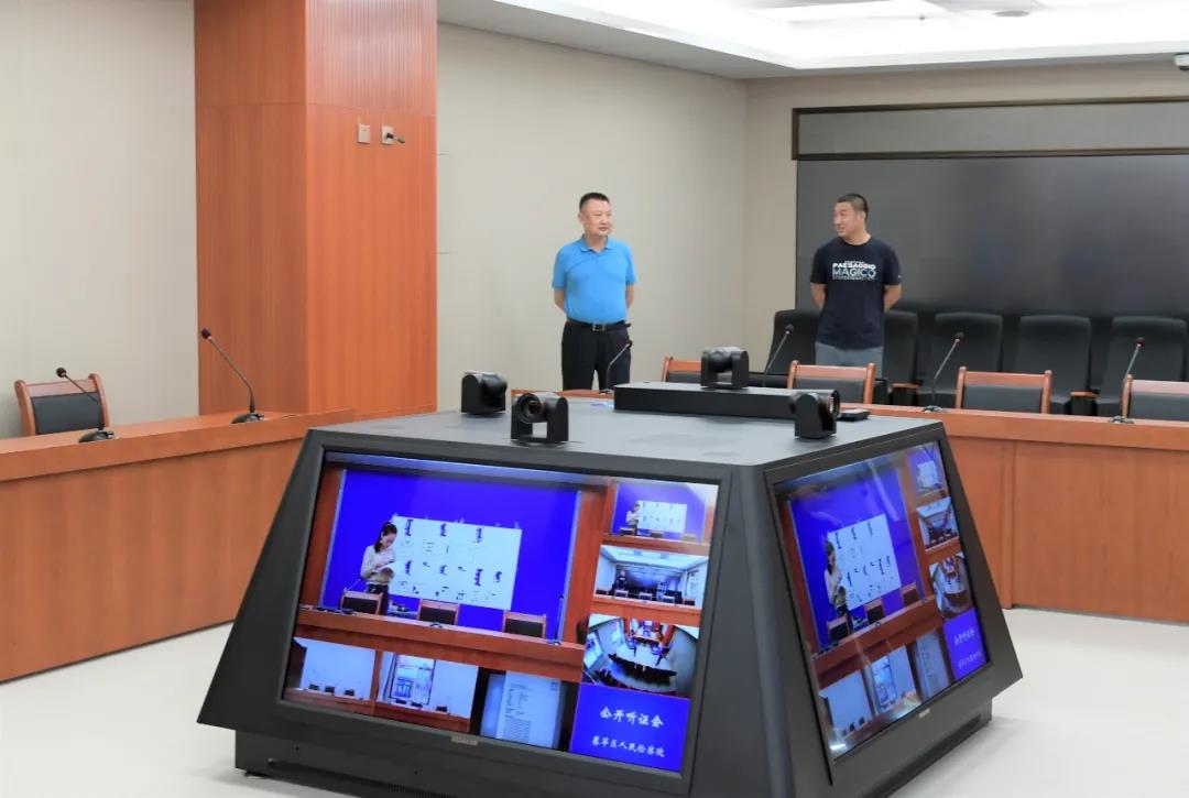该听证室使用面积114.3平方米,设置主持席、听证人席、双方当事人席/控辩双方席、旁听席、导播席以及视听呈现六个区域。采用高集成、高性能、高质量的听证专用设备,将科技创新与听证业务深度融合。听证工作台采用一体化结构设计,集成高清液晶显示屏、高清摄影机、高清听证主机、智能中控主机、扩声系统等模块,拥有效果卓越的全场景音视频解决方案,可实现四方位全场景的角色采集、“面对面”的真人呈现,确保听证工作便捷、高效、严谨开展。